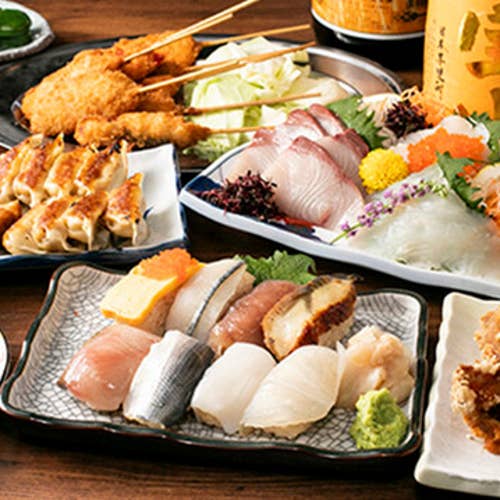 《居酒屋 だるま 京都河原町店》は、寿司・串カツ・餃子・焼鳥など、人気メニューが勢ぞろいの食べ飲み放題が自慢♪